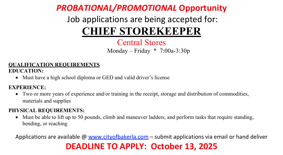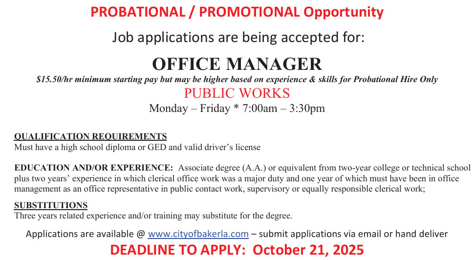 The application is available online at www.cityofbakerla.com or at City of Baker City Hall